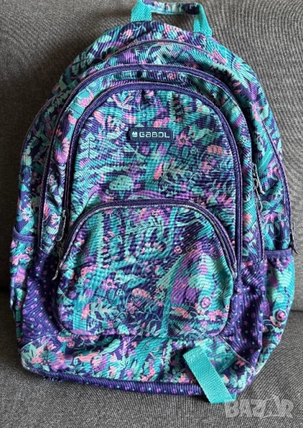 2/ Лилаво-зелена раница Gabol, носена е повечко, с нормални следи от употреба, основно - протриване на държачите на циповете. Може още дълго да се ползва - като резервна раница, за спорт, екскурзии и др. Цена 15 лв.