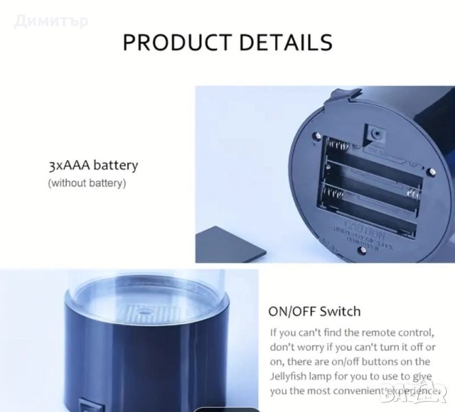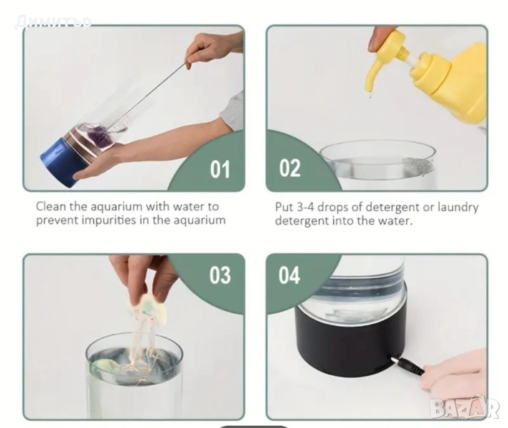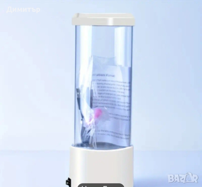 Лед лампа, бяла на цвят с 2 бр. медузи. Захранване с батерии и кабел с usb. След пускане се сменят няколко цвята и медузите плуват, във водата се сипват 3-4 капки препарат за съдове! Вижте и другите ми обяви!