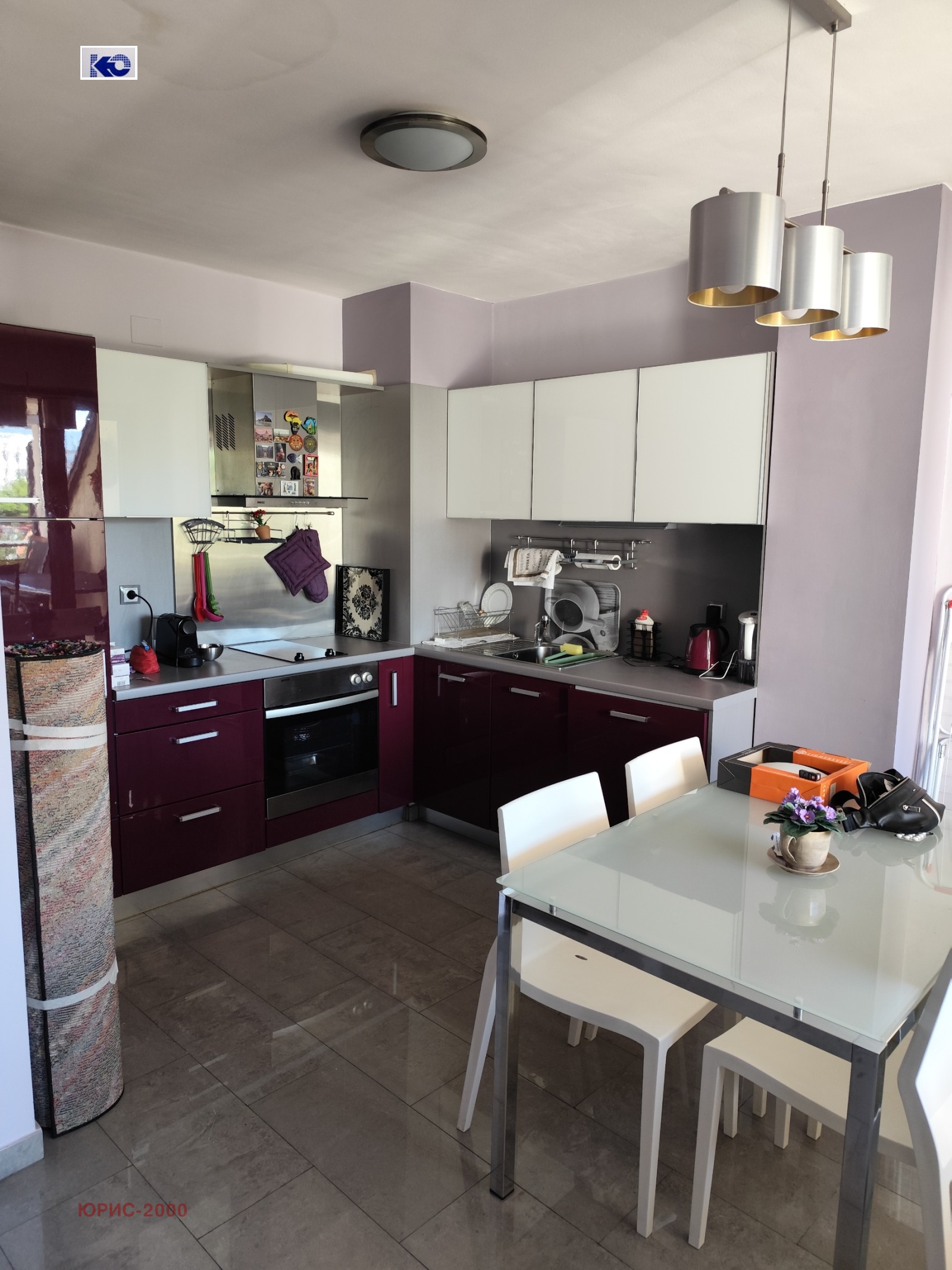 масичка, секция и телевизор, трапезария с кухненски бокс-напълно оборудван с вградени керамични котлони, фурна и аспиратор, вграден хладилник, вградена автоматична пералня, висока маса с 4 стола, климатик, баня с тоалетна-напълно заредена, коридор и РАЗКОШНА покрита тераса С ПЛОЩ от 25кв.м., която е извън площта на жилището, оборудвана с маса и столове за сутрешното кафе или чаша вино. Отоплението е с климатик. Много светло и топло жилище, на тихо място. Жилището е след основно освежаване. Снимките са реални. Без домашни любимци! С ключ за имота!