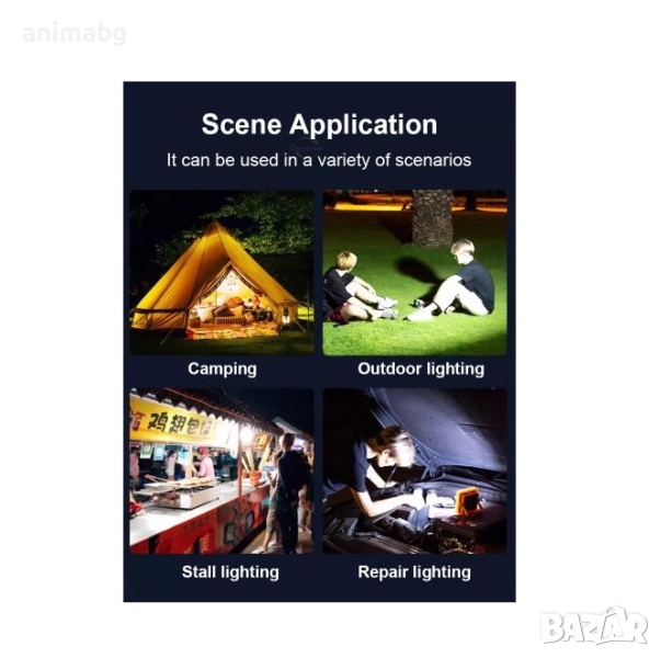 5 режима на осветление ✔ Бяла светлина ✔ Топла светлина ✔ Червена и синя аварийна светкавица ✔ Регулируема яркост ✔ Управление с един бутон , Покрива до 300㎡ Широкоъгълно осветление за употреба на закрито и открито , Многопосочно използване Използвайте го ръчно / стойте на повърхност / окачете с кука Чудесен за къмпинг, ремонт на автомобили, строителство и други