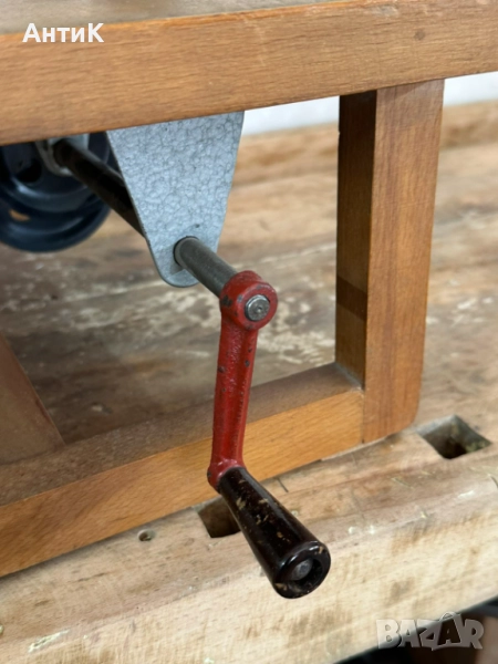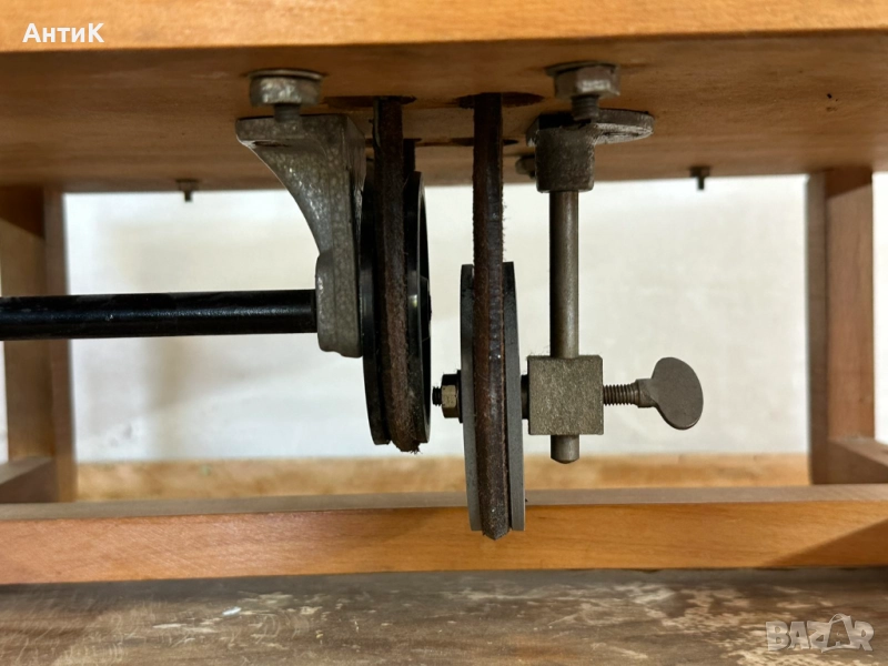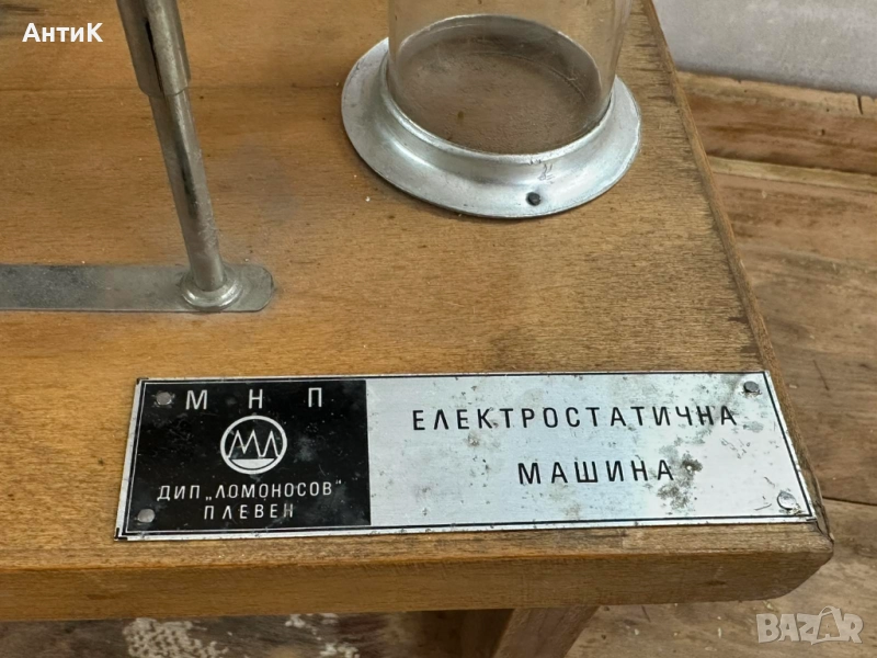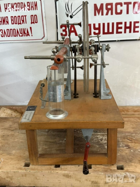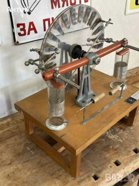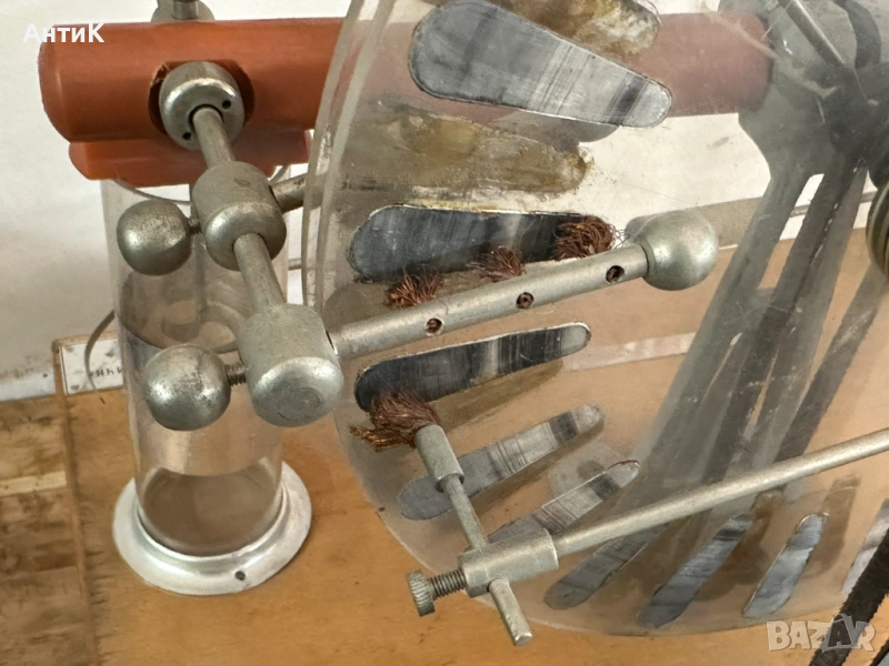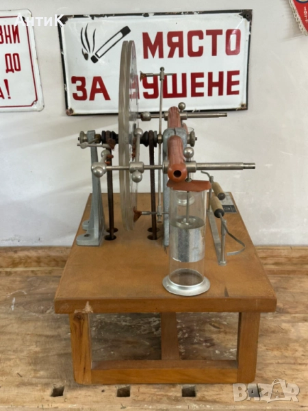Модел ползван в часовете по физика през 70-те и 80-те години на миналия век. Състояние видно от снимките. При завъртане на ръчката се завъртат и големите колела посредством предавка от кожени ремъци.