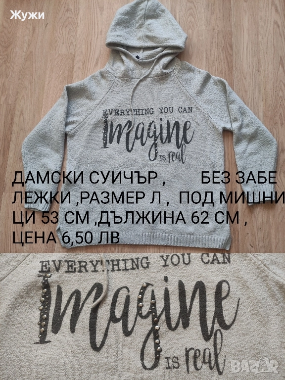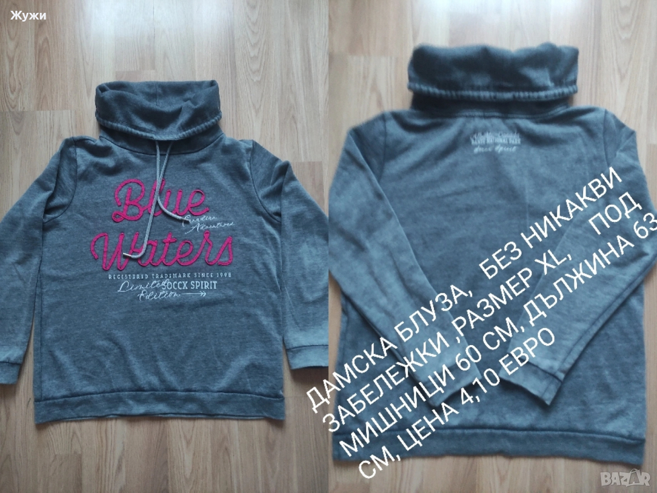 ДАМСКА лятна блуза размер XL без забележки цена 6,50 лв. ДАМСКА блуза с дълъг ръкав, размер XL, без забележки, много мека и топла материя. цена 5,90 лв. СЛЕДВА снежно бяла дамска блуза много мека и приятна материя размер XL без забележки цена 5 лв.. ЧЕРНА дамска блуза, без забележки, под мишниците е 54 см ,цена 5,90 лв ,размер ХЛ, на раменете е с подплънки. ДАМСКА блуза с къс ръкав, без забележки цена 6,50 лв ,размер XL. СЛЕДВА дамска жилетка размер XL цена 5,90 лв.ЧЕРНА дамска блуза с качулка без забележки размер XL цена 7,90 лв. РОЗОВА дамска блуза без забележки размер XL цена 5.90 лв.