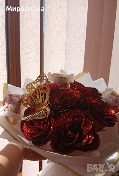 Букет с блестящи, червени рози и бонбони рафаело. С картичка, опаковъчна хартия, брой на розите и бонбоните по ваш избор.