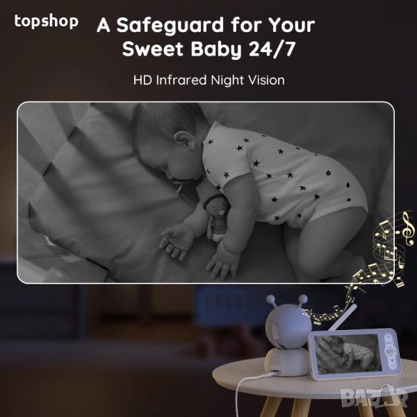 【Камера с панорамно завъртане, накланяне и увеличение и автоматично проследяване】Бебешката камера с функции за панорамно завъртане 350° и накланяне 55° ви позволява лесно да виждате всеки ъгъл на стаята, функцията за автоматично проследяване гарантира, че камерата остава фокусирана върху вашето мъниче, дори когато то се движи.