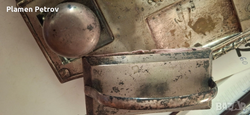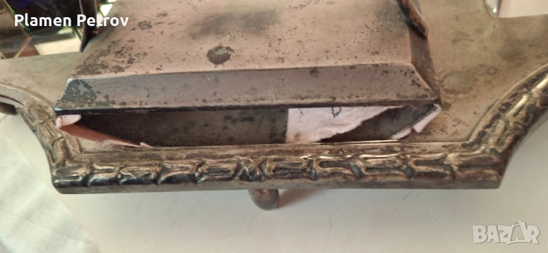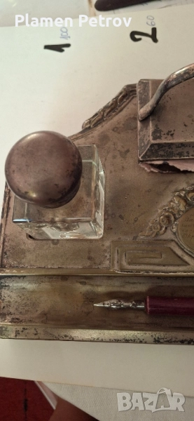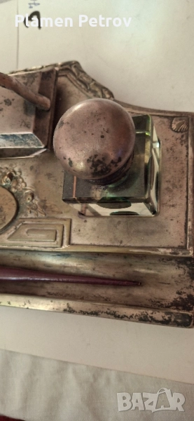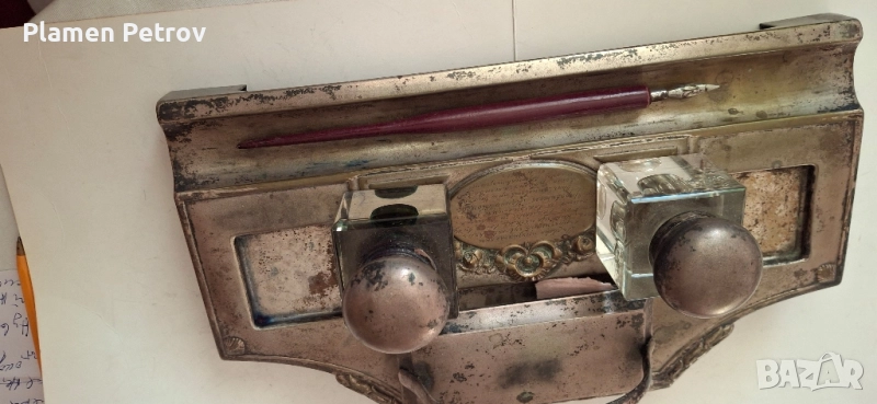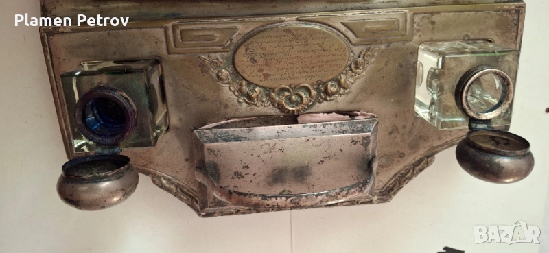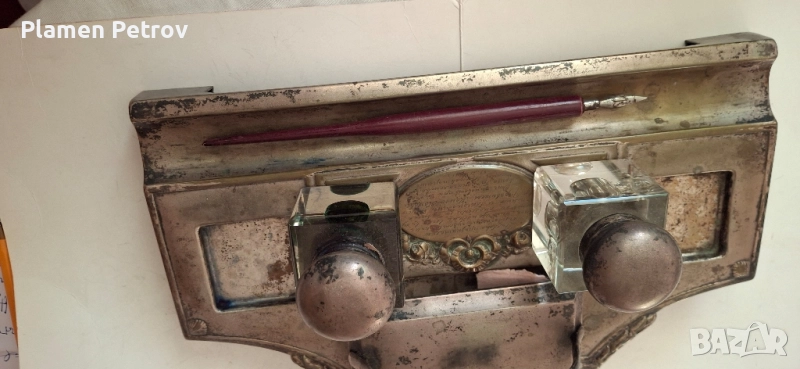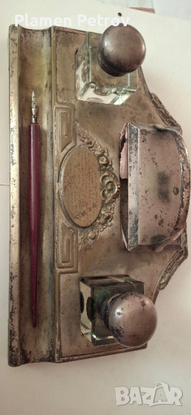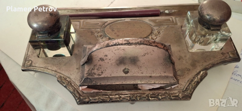 стара двойна мастилница от месинг/посребрена/изработена около 1910 година Ар Нуво с размери от 32 см дължина и ширина 19 см, състояща се от два броя за мастило, попивателна с хартия и стара перодръжка с перо Цар Борис 1918 година има щемпел