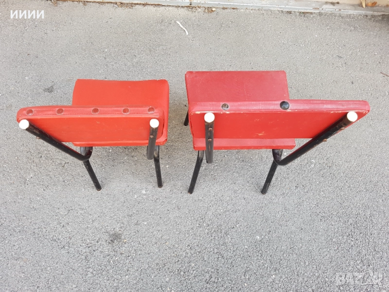 Изработени са от тръбна мебел здрави и годни за дълга употреба. Височина до седалката 27 см и ширина 29 см. На другия до седалката 24 см и ширина 24 см. Цената е за двете.