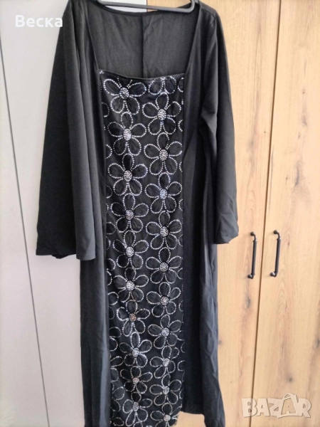 Роклята е нова, подходяща за хени с по-широки рамене и голям бюст. Плата е плътен и леко еластичен. Гръдна обиколка 122 см, талия 112 см, дължина 140 см. ханш 140см. Моля без пазарлъци!