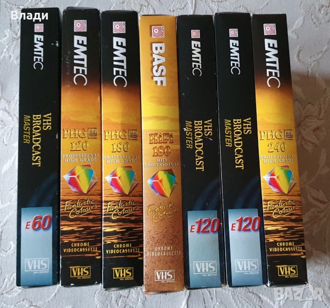 Предлагам втора употреба висок клас VHS видеокасети BASF PHG 180, EMTEC PHG 180 налични около 100бр.- 180мин.Касетите са като нови с перфектно гладка лента и много добър външен вид. Пазени и съхранявани през годините без мухъл. Цената е крайна 4 € за брой