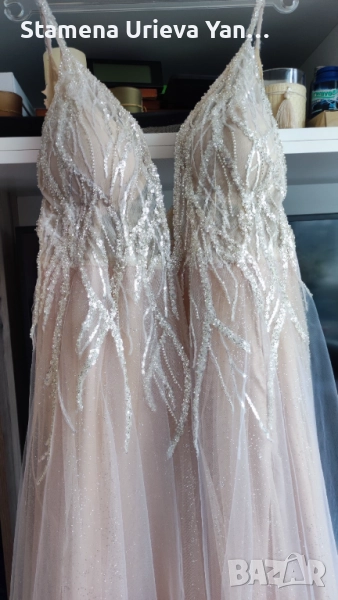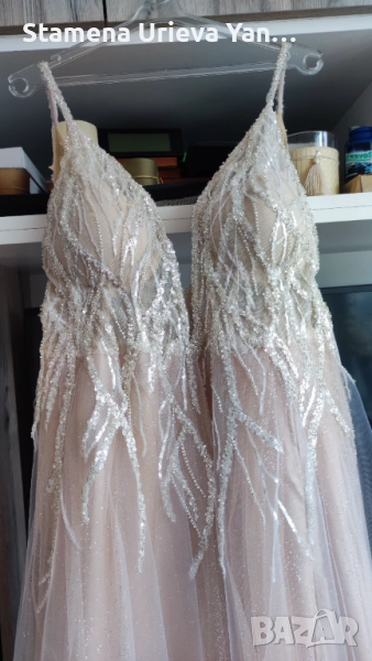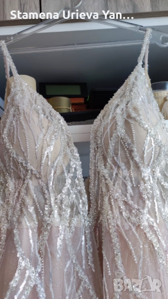 Това, че е изработена от дизайнер я прави изключително уникална и Вие ще бъдете неотразима във вашия ден и ще запази спомена и емоцията вечно. Роклята не е обличана никога, чисто нова е. Цвят - екрю, размера е за дама около 70кг. Има красиво деколте, което подчертава бюста, много специфично е и вашата красота ще изпъкне. Изработено е с чашка, с добавен сутиен допълнително.Обиколка на бюста около 90C .