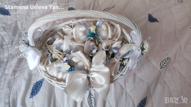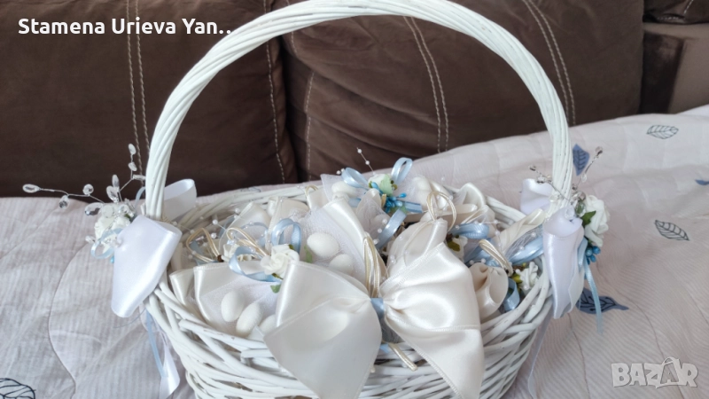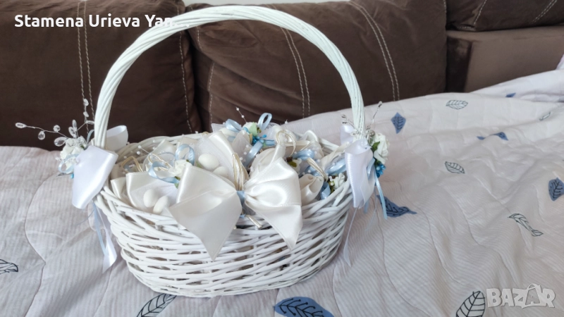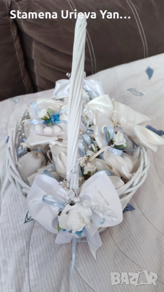 Ръчна изработка. Нежни цветове - синъо и бяло. Изключителна класа и финес! Сватбената кошница, която ви предлагам е с абсолютно същите цветове като букета, за да е всичко в тон и на ниво.