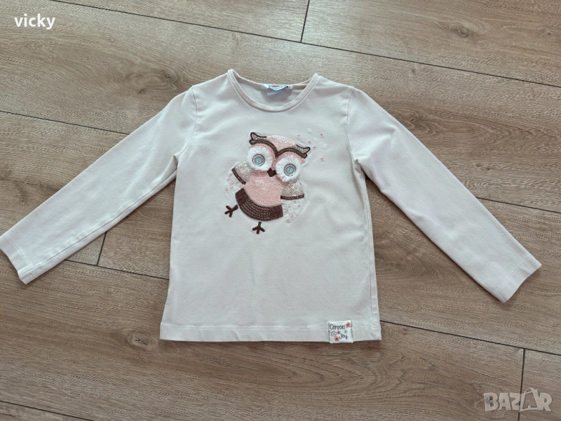 Детска блузка с дълги ръкави от плътна памучна материя в бежов цвят. Блузката има изключително красива апликация на блестящо бухалче. Размеът е 98см, подходяща за 2-3г възраст. Еластична материя.