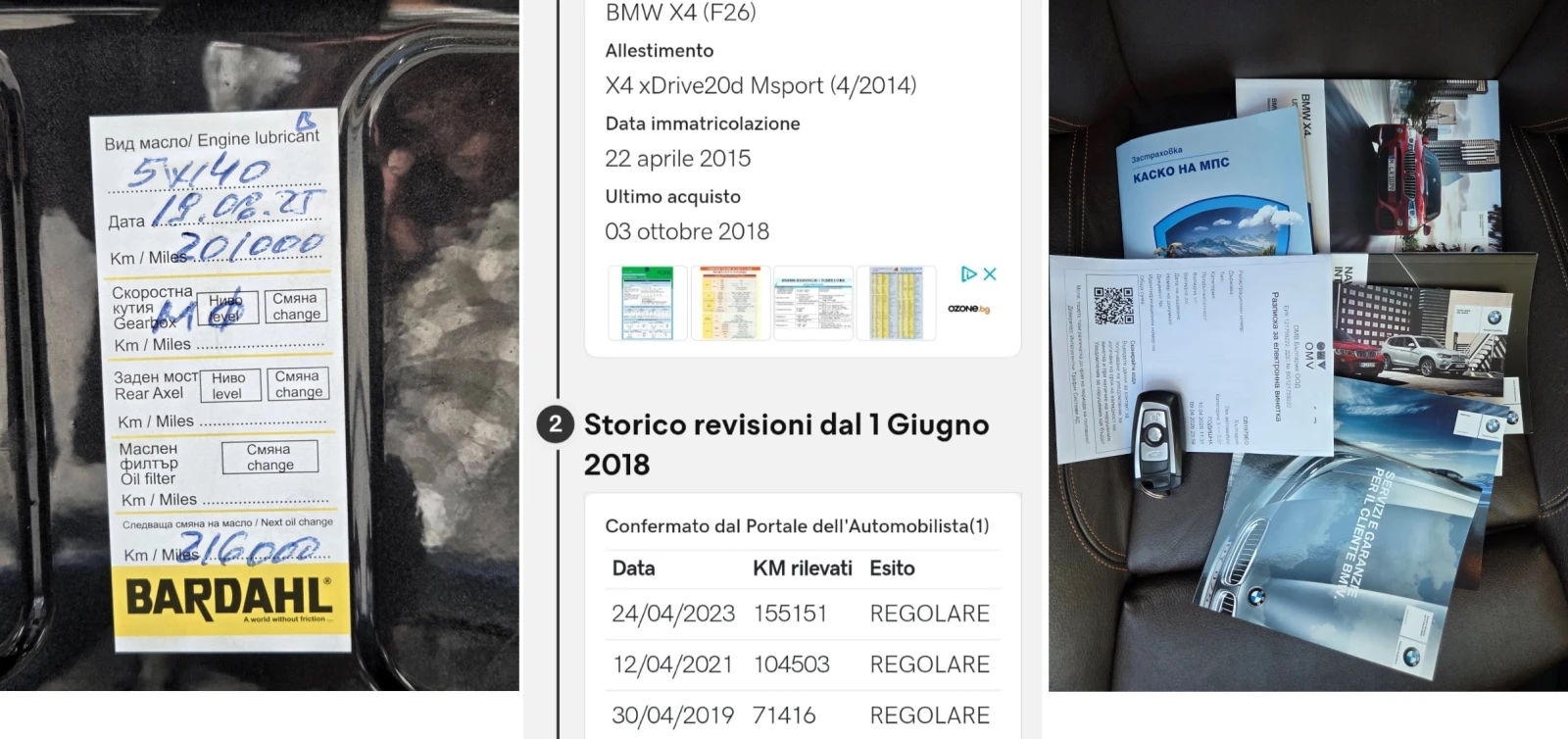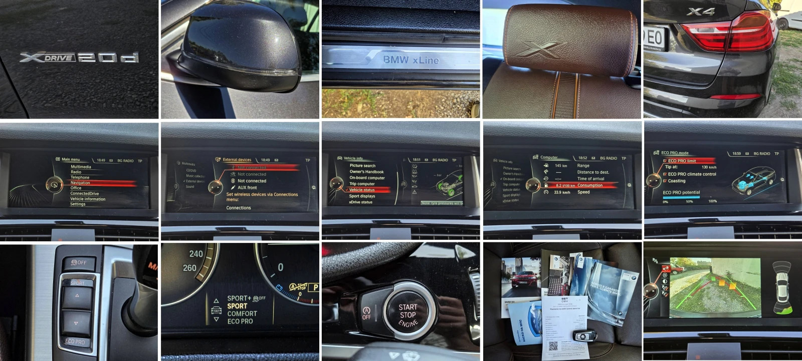 Отлично състояние! Регистриран! Обслужен! 4x4! Кожа! Автомат! Навигация! Камера за заден ход! Euro! LED & XENON! КАФЯВ САЛОН! X Line! Всичко платено - ВИНЕТКА, Гражданска Отговорност, КАСКО, Годишен Технически Преглед, Годишен Данък! Отлична работа на мотор и скорости! Стегната ходова част! АВТОМИБИЛЪТ СЕ КАРА ВСЕКИ ДЕН, ЗА ОГЛЕД, МОЛЯ ПОЗВЪНЕТЕ ПРЕДВАРИТЕЛНО! Сменени ФИЛТЪР КАРТЕРНИ ГАЗОВЕ, ТУРБО, ДИСКОВЕ, НАКЛАДКИ! МАСЛО НА СКОРОСТИТЕ! МАСЛО НА ДИФЕРЕНЦИАЛИ! МАСЛО НА МОТОРА И ФИЛТРИ маслен, въздушен, горивен, купе! ВЕРИГА В ОТЛИЧНО СЪСТОЯНИЕ! LED дневни светлини! LED стопове! BiXENON автоматични адаптивни ксенонови фарове! Автоматично превключване къси/дълги! START/STOP SYSTEM - система за за екологичен и икономичен режим на работа на автомобила! DRIVING MODE SELECTION 4 режима на управление COMFORT, ECO PRO, SPORT, SPORT +! НАВИГАЦИОННА СИСТЕМА с ТЪЧ скрийн и карти на България и Европа! USB/AUX/DVD/CD/BLUETOOTH! Ел. ОГЛЕДАЛА с ПРИБИРАНЕ, ПЕДГРЕВ и автоматично затъмняване! ISOFIX система за монтаж на детски столчета! ПАРКТРОНИК - ПРЕДЕН и ЗАДЕН с ВИЗУАЛИЗАЦИЯ! КАМЕРА ЗА ЗАДЕН ХОД! ОРИГИНАЛНИ ЛЕТИ ДЖАНТИ BMW X4 XDrive 20d 2. 0d 190кс, Euro 6 , първа регистрация 04. 2015г, 8 степенна АВТОМАТИЧНА СКОРОСТНА КУТИЯ с ТИПТРОНИК и с възможност за СМЯНА на ПРЕДАВКИТЕ от ВОЛАНА, DRIVING MODE SELECTION с 4 режима на управление COMFORT, ECO PRO, SPORT, SPORT +, КАФЯВ КОЖЕН САЛОН в отлично състояние, ДВУзонов КЛИМАТРОНИК, ПРЕДЕН и ЗАДЕН ПАРКТРОНИК с ВИЗУАЛИЗАЦИЯ, КАМЕРА ЗА ЗАДЕН ХОД, 4бр. ел. стъкла - фабрично тонирани, ел. отопляеми огледала, навигационна система / мултимедия с Bluetooth/USB/AUX/CD/DVD/SD, XENON фарове, LED дневни светлини, оригинални лети джанти. Автокъща Веронис работи от понеделник до събота, от 9 до 18ч. Неделя - почивен ден.
