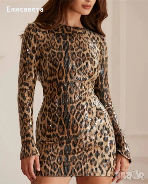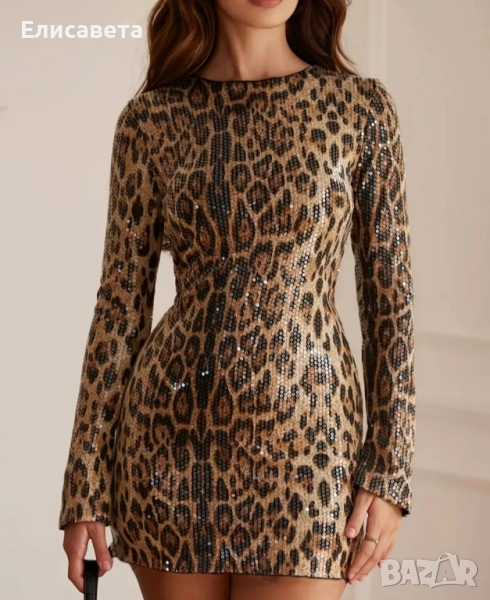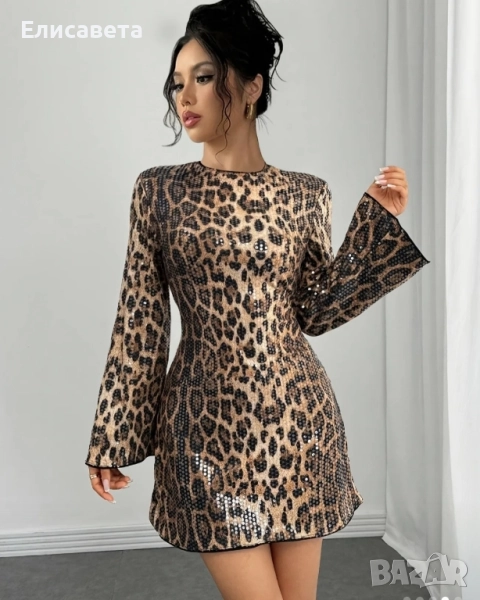 Дамска модерна рокля леопардов цвят с паети.