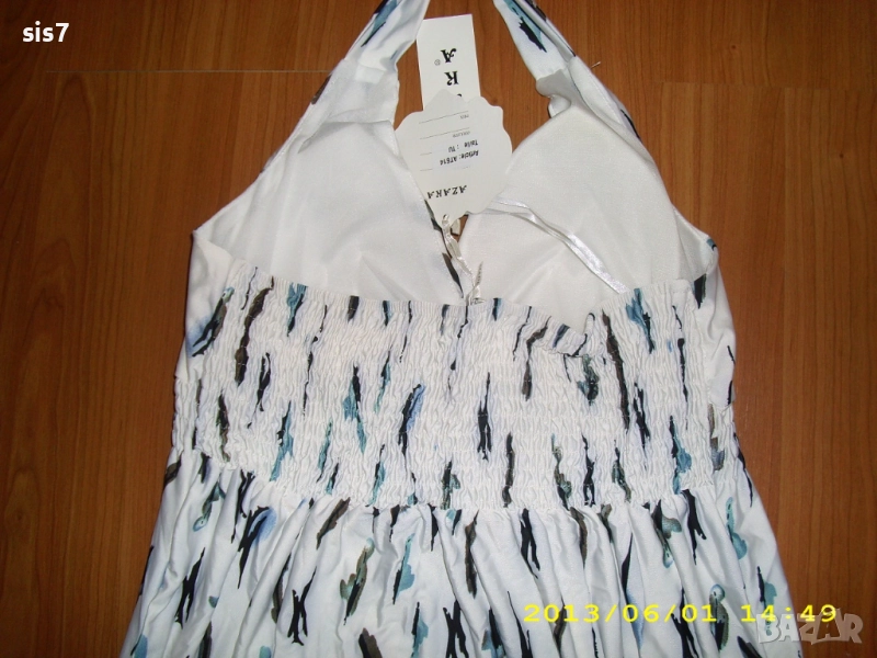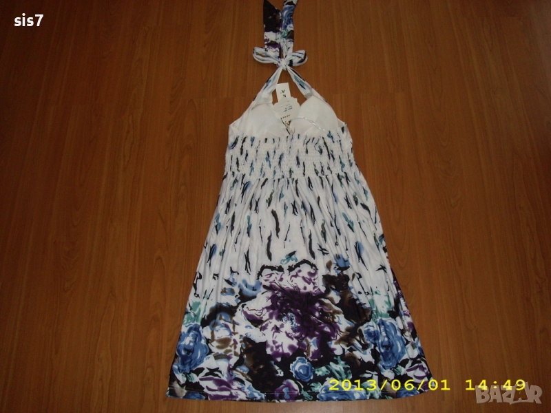 Чисто нова с опаковка.Чудесна е и като материя,100% рециклиран полиестер,чудесна и като качество на изработката.Поръчана от Англия.Много хубаво седи,като на манекенката,на бюста са подплатена и може да се носи и без сутиен,а на гърба с ластик и позволяват отпускане,а и не се свлича.Размер по етикет 8-12(английки);38/40 или С/М (български). Размери:дължина цялата-90;от края на бюста отстрани-67;дължина от края на ластика до долу-54;ширина при бюста-34,но с еластичност и се разтяга до 43 спокойно.