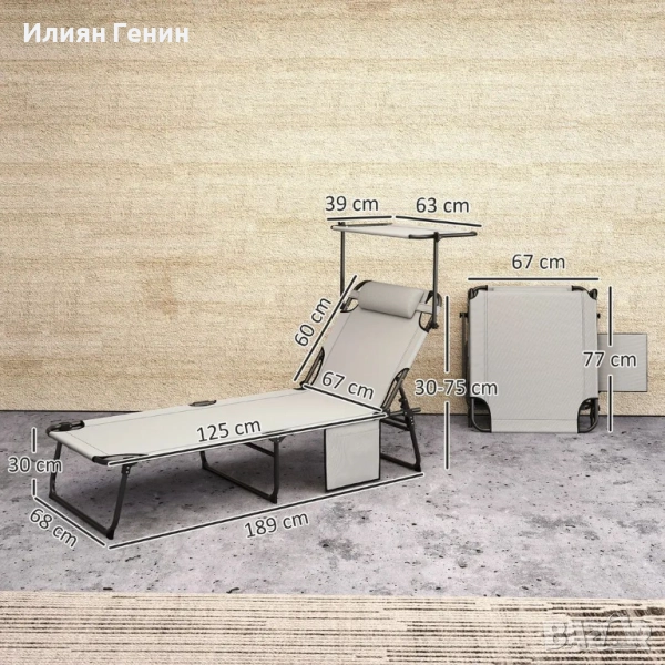 Информация за продукта шезлонг: Размери в разгънато положение: 68Д x 189Ш x 30В см, размери в сгънато положение: 67Д x 77Ш x 15В см. Необходим е монтаж.