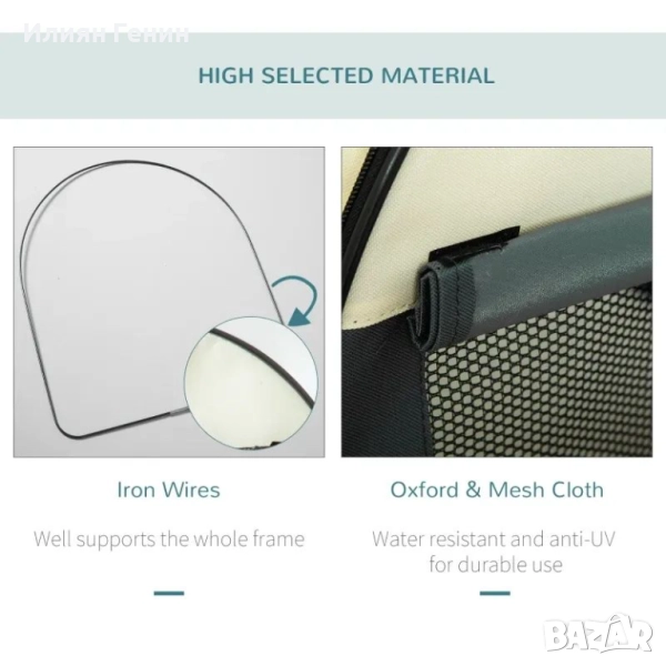 Здрава конструкция: Стоманена рамка и водоустойчива PVC промазана 600D Oxford материя, подходяща за ежедневна употреба и ще издържи на драскотини от вашия домашен любимец. Четири колчета за стабилност, когато е необходимо.