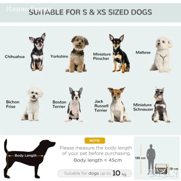 Идеален за миниатюрни и малки кучета с дължина до 45 см и тегло до 10 кг