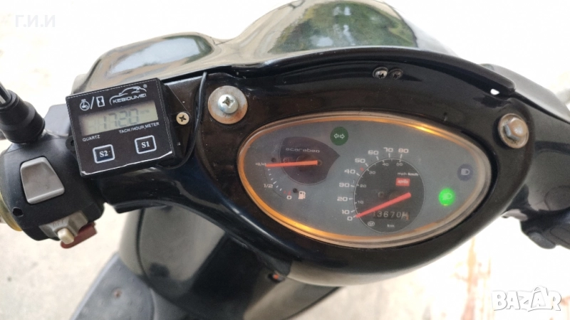 Няма регистрация, бракуван (талоните са налични)! В движение, въздушно охлаждане на двигателя, сменени : масло ДВГ - Motul 10W40, масло трансмисия, нов акумулатор, ремък, нов съединител, нови : спирачен диск(ОЕМ), накладки и челюсти, перка охлаждане на вариатора, ролки вариатор, въздушни и горивен филтри, клапан за бензин, бендикс на стартера, нов привод( охлюв) на километража, нови ключалки запалване и на жабката с два ключа, нови вътреши гуми( гумите са в добро състояние). Допълнително монтиран оборотомер, Повдигач на задният амортисьор, давам и куфар за багажника. Оригинален карбуратор KEIHIN CVK18 с оригинален ел. смукач ! Максимална скорост, която съм достигал е 60 км. по GPS. Външни забележки ! Може без акумулатора за 550 лв.