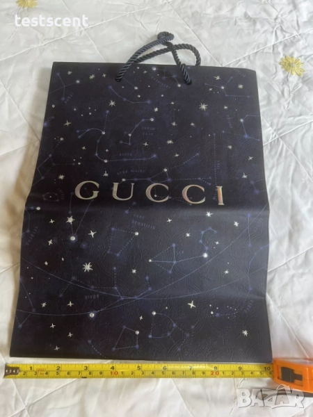 Луксозна, автентична хартиена пазарска торбичка Gucci Holidays в синьо със сребристи акценти и звездно-небесен дизайн. Специално издание за празничния сезон, което съчетава елегантност и колекционерска стойност. Подходяща за подарък, декорация или съхранение.