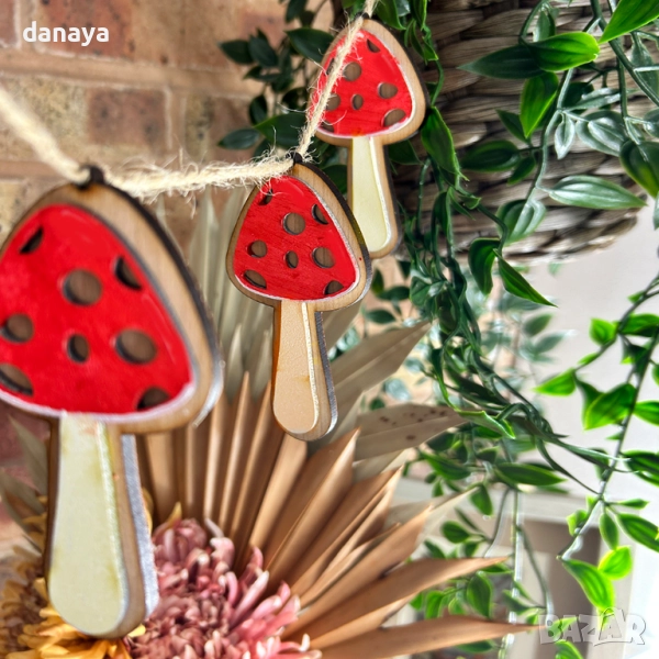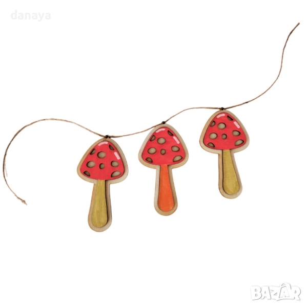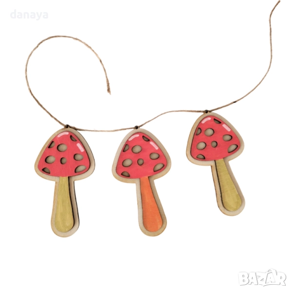 Комплект от 3 броя малки висящи дървени гъбки. Декоративна гирлянда с дървени гъбки е чудесен акцент за есенна украса у дома, в офиса, заведение или класна стая. Подходяща е за декорация на стена, прозорец, врата, камина или като елемент в тематични аранжировки. Съчетава се идеално с тикви, есенни листа и други природни елементи, като създава топла и уютна атмосфера.