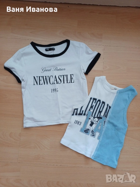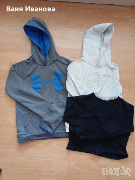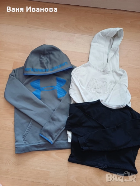 Продавам спортни тениски, блузи и худита. Нямат следи от употреба и са много запазени. Размерите са детски, но за повече информация на лично. Тениските са по 7евро всяка. Потника и късата тениска по 8 евро. Худи Under Armour 12 евро. Бяло худи 13 евро. Черна блуза с дълъг ръкав 7 евро.