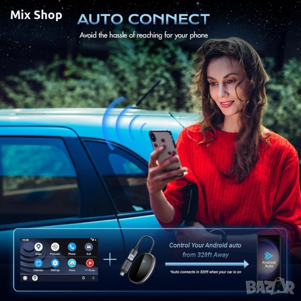 Този безжичен адаптер за Android автомобил е съвместим с повече от 800 модела автомобили и поддържа Google, Samsung, OnePlus и други смартфони с Android 10+. Нашият адаптер осигурява перфектна интеграция с вашия смартфон (само за автомобили с кабелен Android, не с iOS).