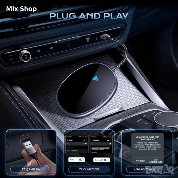 CarPlay. Просто включете нашия адаптер в USB порта на колата си и той автоматично се свързва с вашия смартфон с Android 10+ или по-нови устройства, готов за секунди. Без чакане, без настройка, просто чисто удоволствие от шофирането.