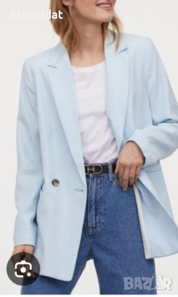 Светло син блейзър двуредови копчета H&M. За елегантна или спортна визия. Подходящ както с дънки и кецове, така и с ролята, пола или панталон. Размер Л , подходящ и за ХЛ. Гръдна до 112см, дължина 75см Цена 49лв