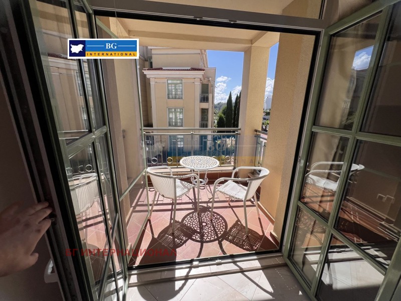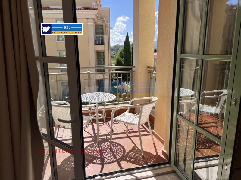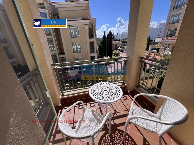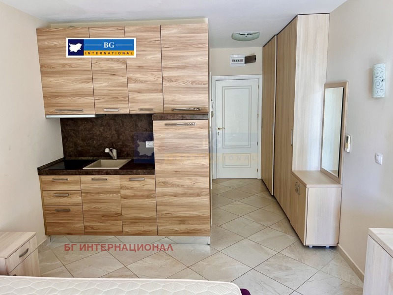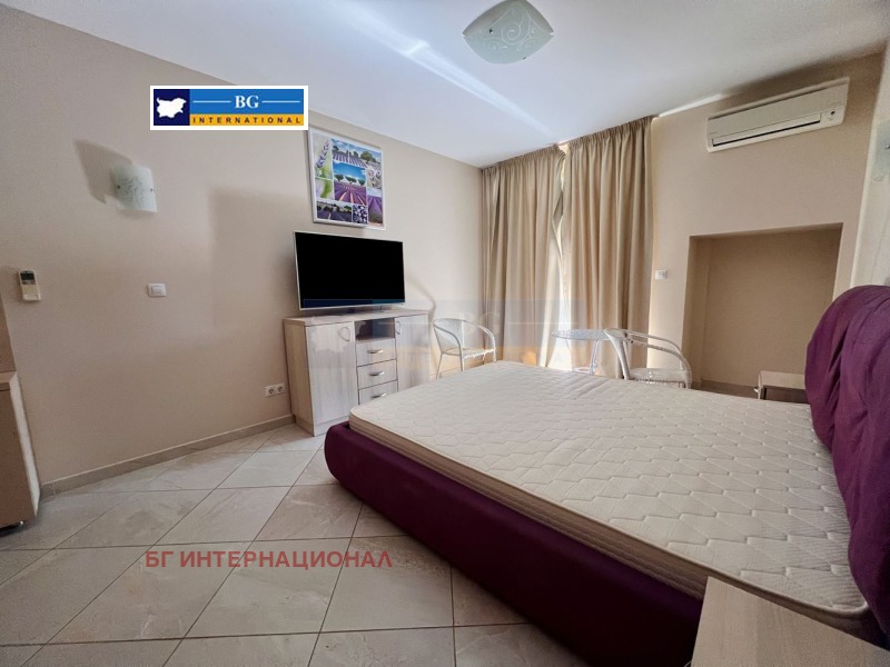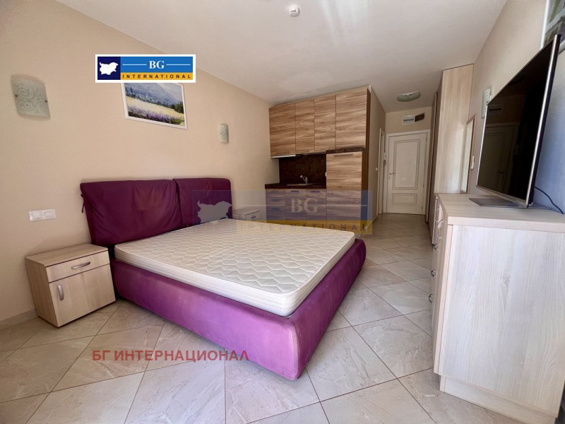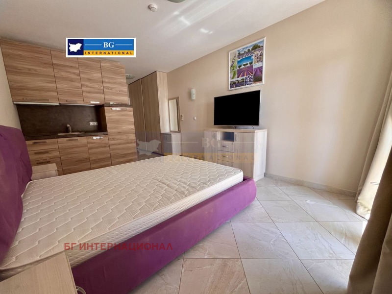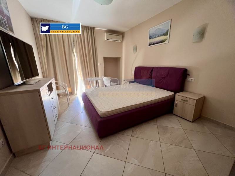 Мебелирано студио в емблематичен затворен тип комплекс на първа линия море.Жилището се състои се от преддверие, дневна с кухненски бокс. баня с тоалетна. склад и тераса,На втори етаж в сграда с асансьор.