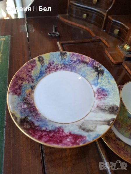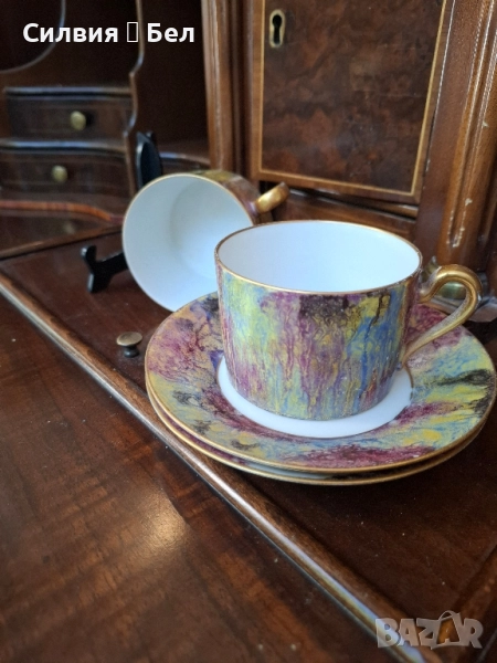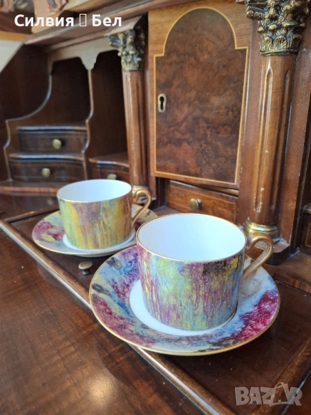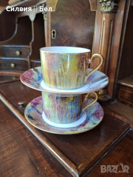 Limoges Paris" Предлагам красив винтидж комплект от две чаши за кафе или чай с техните чинийки. Дизайнът е уникален – имитация на мрамор в наситени и преливащи се цветове, включително златисто, лилаво и синьо. Дръжките и ръбовете на чинийките са фино позлатени. Комплектът е маркиран на гърба с "Limoge Paris" и "Made in France". Limoges. Перфектен за колекция или за елегантна закуска. Всяка чаша и чинийка са с уникален и артистичен дизайн, наподобяващ мраморна текстура. Цветовете са богати и наситени – наситено лилаво, синьо, жълто и златисто, които се преливат по изящен начин. Фините, извити дръжки на чашите и ръбовете на чинийките са украсени със златен кант, който придава луксозно усещане. На дъното на чинийките е поставен печат "Limoge Paris, Made in France", което потвърждава произхода и качеството на изделията. Този комплект би бил прекрасно допълнение към всяка колекция от порцелан или идеален подарък за ценители.Това е повече от просто комплект за кафе – това е акцент, който ще направи сутрешния ви ритуал по-специален.Позлатените дръжки и фин кант добавят допълнителна елегантност. Комплектът е произведен във Франция, марка, известна с висококачествените си порцеланови изделия. Цена 5️⃣5️⃣лв 28,12 € двоен сет. В наличност 2 сета. •✽✧✽•°”˜🦋”°•✽✧✽•°”˜🦋”°•✽✧✽•°”˜🦋”°•✽✧✽•°”🦋˜”°•✽✧✽• Това е винтидж артикул и няма да е в чисто ново състояние. Възможно е да има малки несъвършенства, които само допълват историята на артикула.