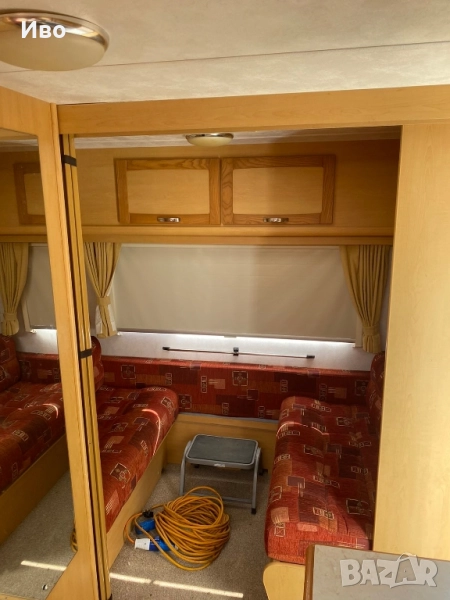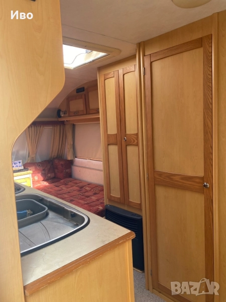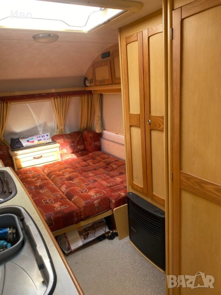 ФОРСЕЛТ. Караваната е нов внос от Англия, в изключително добро - граничещо с перфектно техническо, интериорно и екстериорно състояние(видно от снимките). Няма течове(не е и имала), без лоши миризми и без никаква влажност. Имала е само двама собственици от чисто нова, което е от значение за състоянието. Регулярно подлагана на пълни, годишни, технически прегледи. Подът и стените са идеално здрави и запазени. Всички прозорци са двойни и отваряеми. Гумите са чисто нови и на лети джанти(има и резервна гума с джанта, чисто нова). Караваната е оборудвана с гардероби, множество шкафчета, мивки, комарници и щори на прозорците и вратата, няколко люка (един от най-големите „панорамни“) с комарници и слънцезащитни щори, голям хладилник (с голямата камера-от новото поколение), прилежащите й контейнери за чиста и мръсна вода, помпа за вода, бойлер, печка за отопление, кухня с четири котлона, отделна фурна, грил и кухненски шкаф за посуда(заедно с посудата), който увеличава пространството за съхранение и работното място, кабел за включване в 220 волта, ел. табло за управление на уредите, противопожарна система, голям тягов акумулатор, газова бутилка с газ, две сгъваеми масички и др.