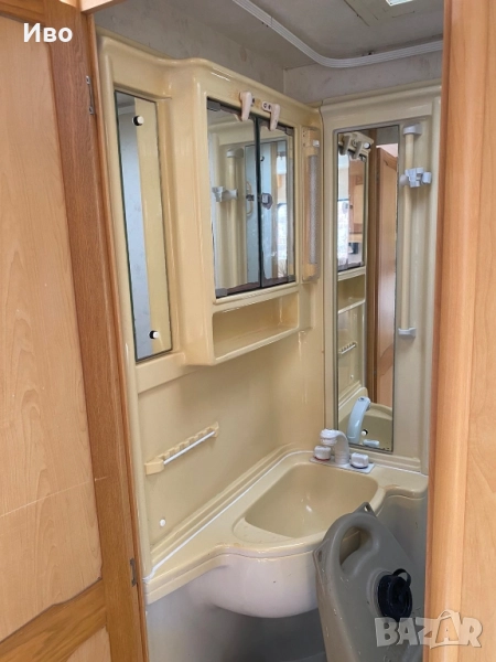 Банята и тоалетната са в отделно помещение с налични мивка,тоалетна Thetford(с външно обслужване), 12V осветление навсякъде (което работи) и 220V.