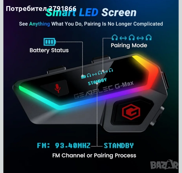 Gearelec G-MAX Bluetooth слушалки за мотоциклетна каска V5.2BT HiFi стерео звук,Екран и RGB светлини