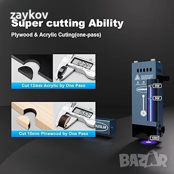 Мощен лазерен модул: AENBUSLM диодният лазерен модул има мощност на машината 80 W и оптична изходна лазерна мощност 10000 mW. Директно гравиране на огледало от неръждаема стомана: Няма нужда от боядисване в черно; Супер бърза скорост на гравиране: неръждаема стомана 304, до 300 мм/сек с фокусно разстояние 45 мм; и забележителна способност за рязане: рязане на акрил с дебелина 12 мм с едно минаване и рязане на борова дървесина с дебелина 20 мм с едно минаване.