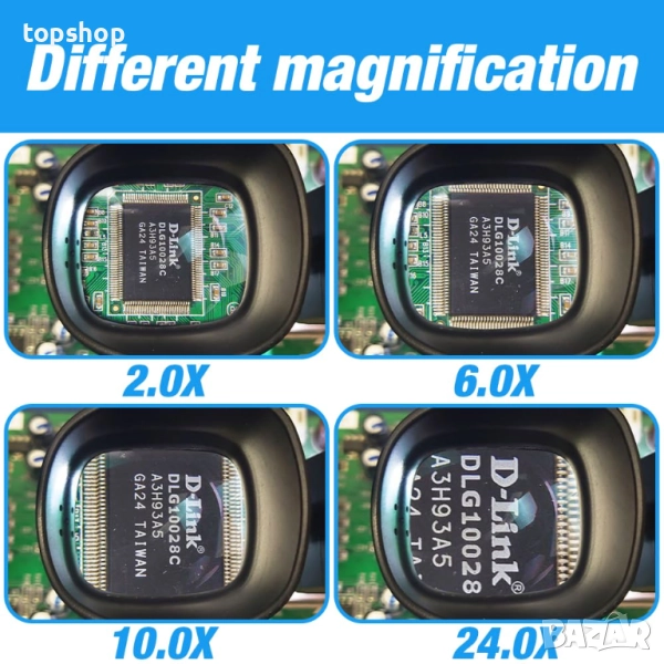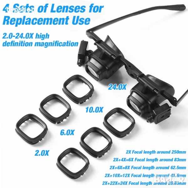 4 комплекта сменяеми акрилни лещи с висока резолюция Нашата лупа има 4 увеличения: 2.0x, 6.0x, 10.0x, 24.0x, които осигуряват подходящо увеличение за различни задачи и отговарят на вашите различни нужди. Тази лупа може да ви помогне да работите по-ясно и прецизно. Кажете сбогом на присвиването на очи и се насладете на ясно виждане отблизо.