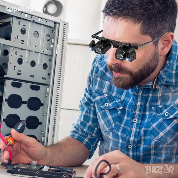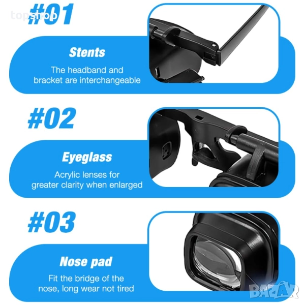 ЛЕЩА ЗА ЛУПА ЗА МОНТИРАНЕ НА ГЛАВАТА Осветената лупа за монтиране на глава е изработена от ергономична рамка за очила, която осигурява комфорт и стабилност, независимо дали работите или четете. Няма дискомфорт, причинен от натиск върху носа, а лупата с лента за глава може да бъде здраво закрепена пред очите, което ви дава повече свобода и безопасност при употреба.
