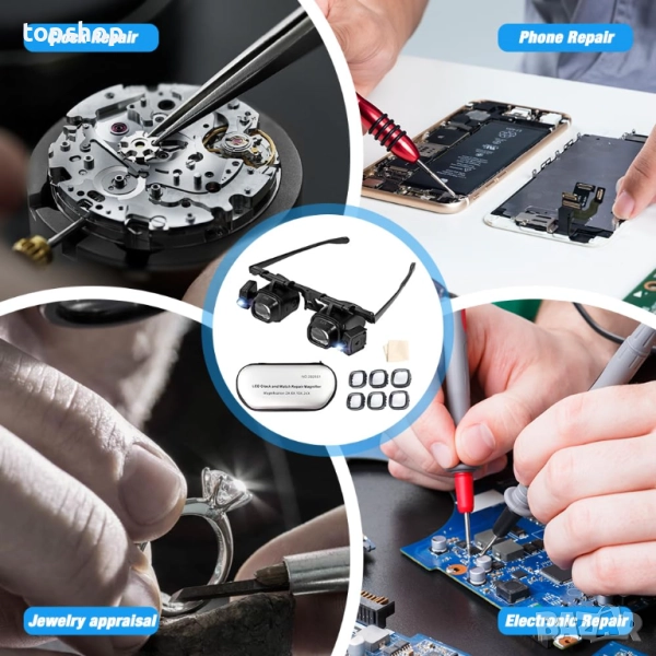 МНОГОФУНКЦИОНАЛНА ЛУПА Осветената лупа се използва широко за четене от възрастни хора, бижута, рисуване, часовници, бродерия, ремонт на електронни продукти и други фини занаяти. Лупата за очила е полезен инструмент за аматьори и професионалисти, които трябва да гледат и осветяват работата си отблизо.
