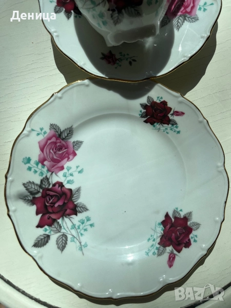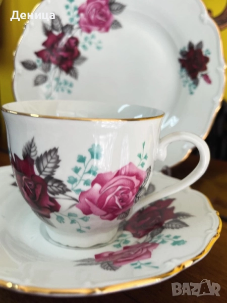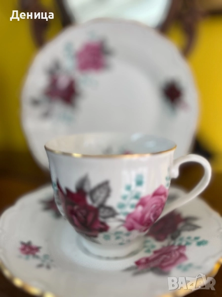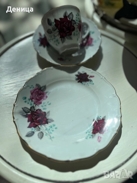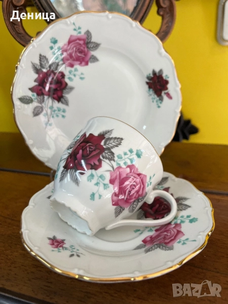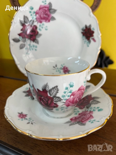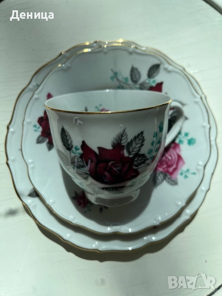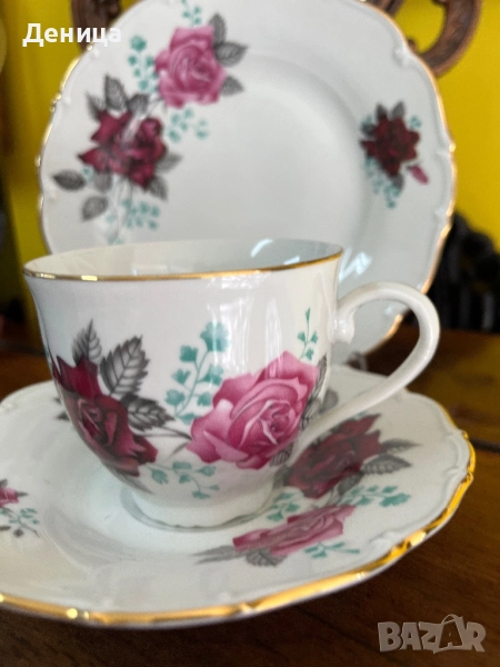 Haas & Czkek Троен сет с нежен златен кант и релеф Винена и розова роза с ментови листенца → Обява 51800629