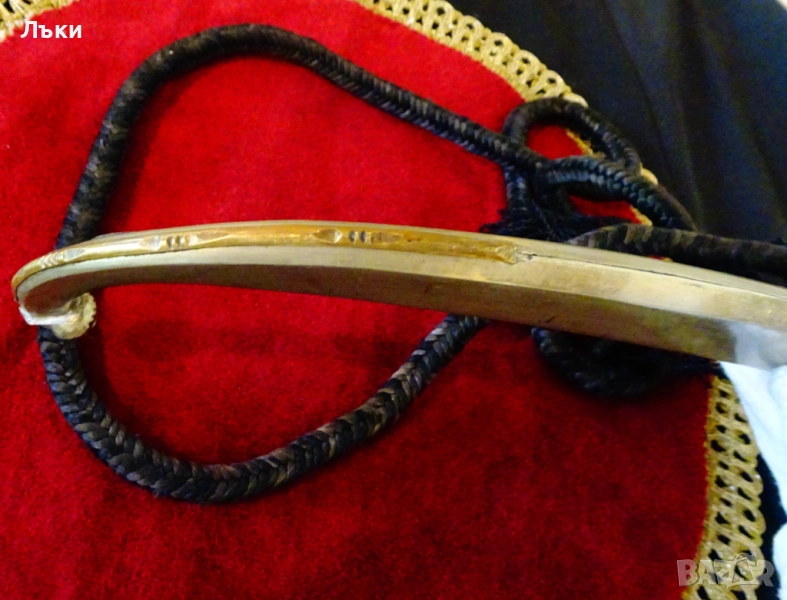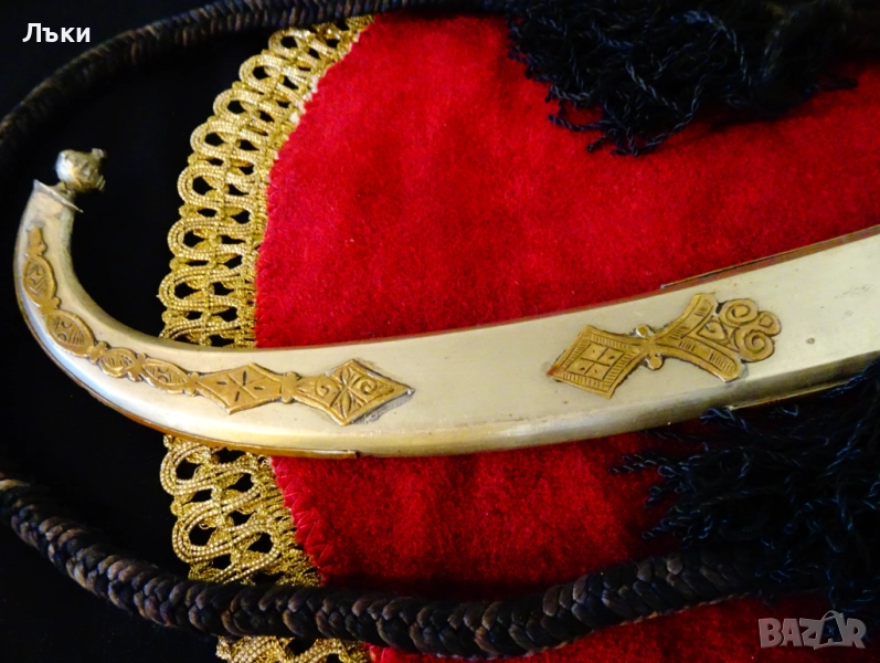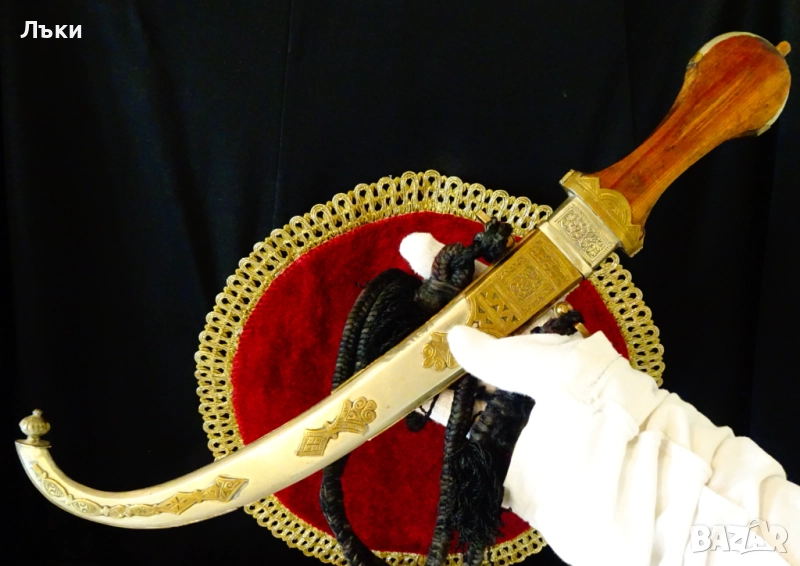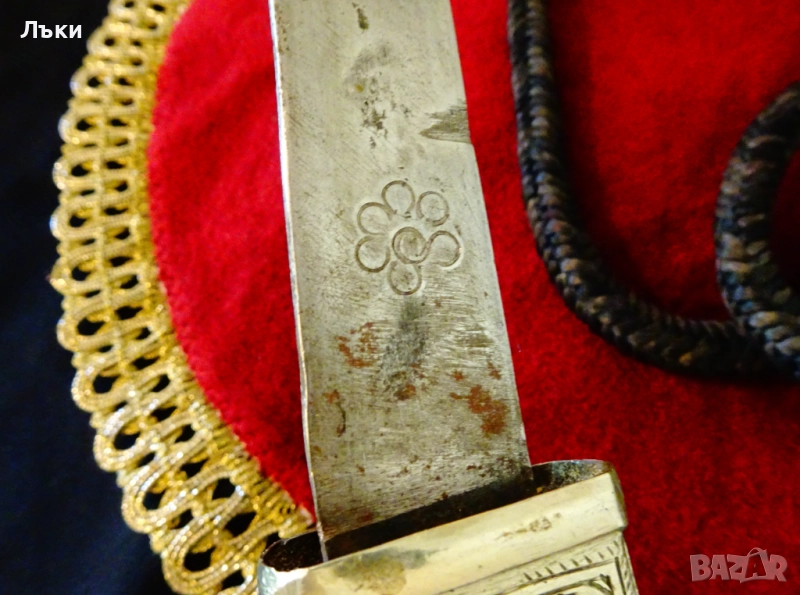 с красиви релефно ковани орнаменти..Камата влиза стегнато в ножницата.Обща