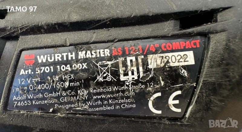 Марка и модел: Wurth AS 12-1/4'' Compact Напрежение на мотора: 12V