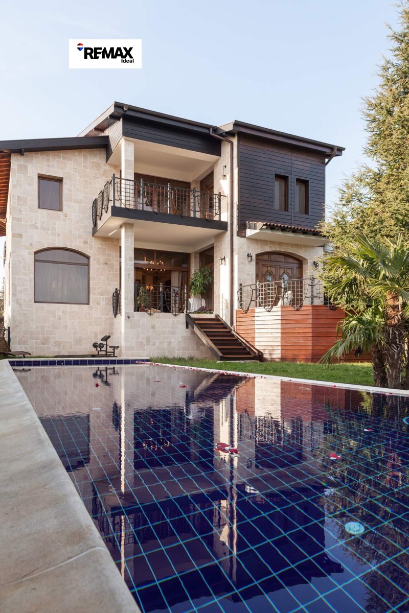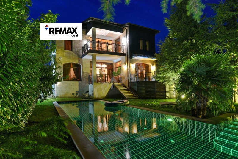 Къщата е с обща застроена площ от 750 кв.м. и е разположена в парцел от 1100кв.м. топ локация, характеризираща се с най-чистия, измерен въздух в района, в непосредствена близост до гора, плажовете на Черно море и на 5 км. от Варна. Имотът е разположен в най-високата част на Евксиноград с прекрасна морска панорама и до него има достъп по 2 асфалтови пътя. Строителството е изпълнено в съответствие с всички екологични норми и с използването на най-качествените налични на пазара материали тухли, камъни, дъбова и тикова дървесина, мед, ковано желязо, лепила Ардекс. Къщата има уникален, бутиков дизайн, екстериорът е направен от солидна тикова дървесина, травертин и естествени камъни. В парцела е разположен 15м отопляем басейн и закрит гараж за 3 автомобила, плюс паркоместа за още 4 автомобила. Дворът е озеленен и създава приятна атмосфера за пълен релакс, тишина и интимност. На 3 етажа са разположение 4 спални / с възможност за преустройство на повече спални/ 5 бани, просторен дневен тракт от 240 кв.м. с кухня и 8 метрово емпоре, сауна, гардероб и джакузи. Имотът разполага със сутерен, пригоден за винарна. Висококачествена дограма масивен дъб, стените са 50см. зид, изпълнени с тухли и естествен камък. Подовете и таваните са направени от естествен дъб, покривът е от дъбова дървесина и мед. Обзавеждането и осветлението са бутикови, ръчна изработка съответно от солидна дъбова и тикова дървесина и ковано желязо. Завесите са Френски, ръчно тъкани. Таваните над спалните са облицовани само с дъбова дървесина, без използването на бетон и желязо. Отопление на газ, електричество, в дневния тракт има и камина. Къщата разполага с СОТ, аларма, противопожарна система, 24 часово видеонаблюдение, инфрачервена бариера и непрекъсната сателитна връзка. Имотът е оборудван със соларна система Wissman 600л. и има собствена система за пречистване на вода.