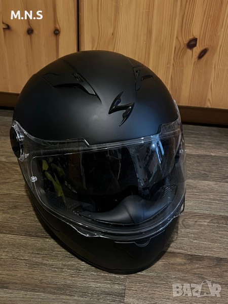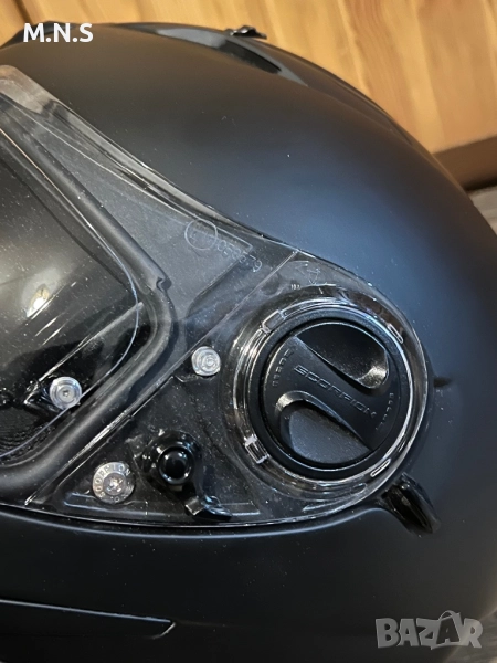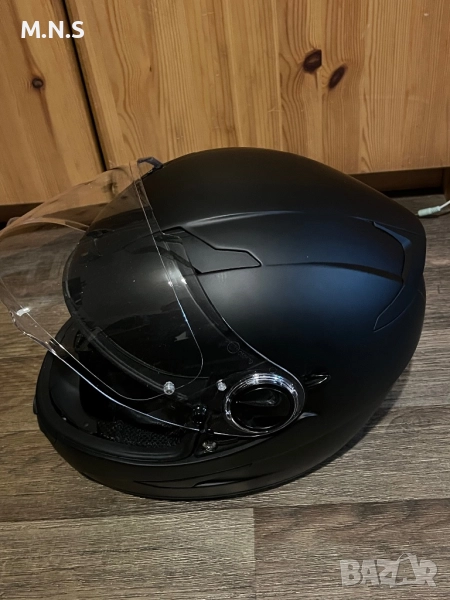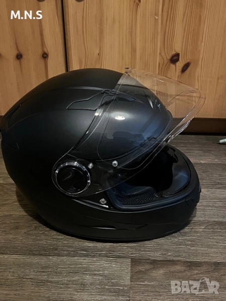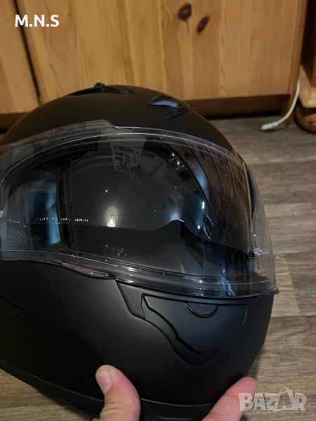 Моторна каска с в градени слънчеви очила .чисто нова цената не се коментира . Има си и калъф .