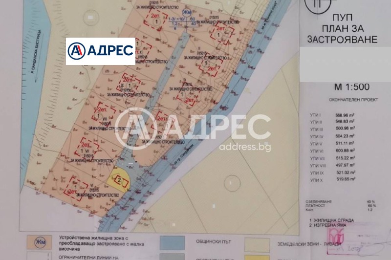 Сандански. Всеки от парцелите е достъпен чрез предвидената обща вътрешна улица, която излиза на главния път. Вътрешната улица и изгребната яма са обособени в отделни УПИ-та и са общи за десетте парцела. Цената на всеки парцел включва и стойността на съответните идеални части от тези общи УПИ-та.