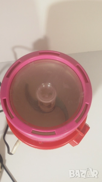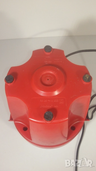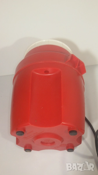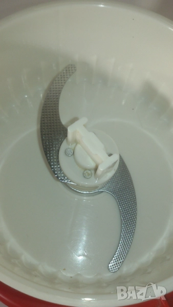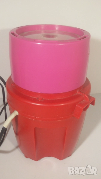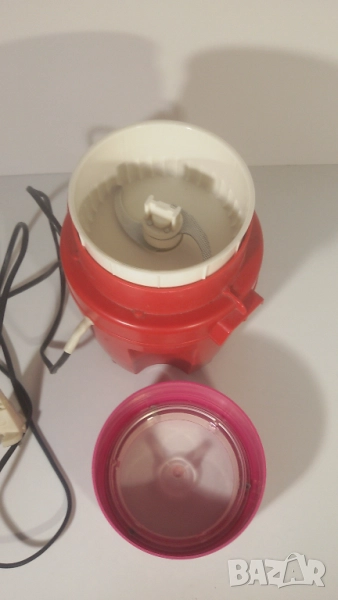 Работи, като розовият капак се натисне върху червената главна част. Като се махне капакът, ножчетата продължават да се движат по инерция. Потенциално опасно, ако човек не внимава, но явно такива са били стандартите, когато е била произведена мелачката.