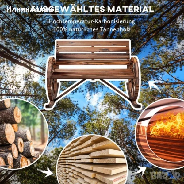 Висококачествена дървена конструкция: Нашата градинска люлка, изработена от естествена ела, впечатлява с автентичната си дървесна шарка и естествен вид. Карбонизираната повърхност не само ѝ придава устойчивост на атмосферни влияния и висока издръжливост, но и непреходен, естетичен щрих.