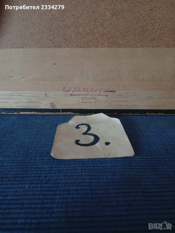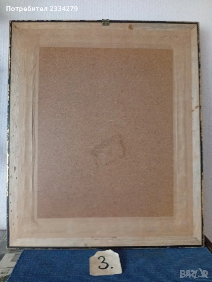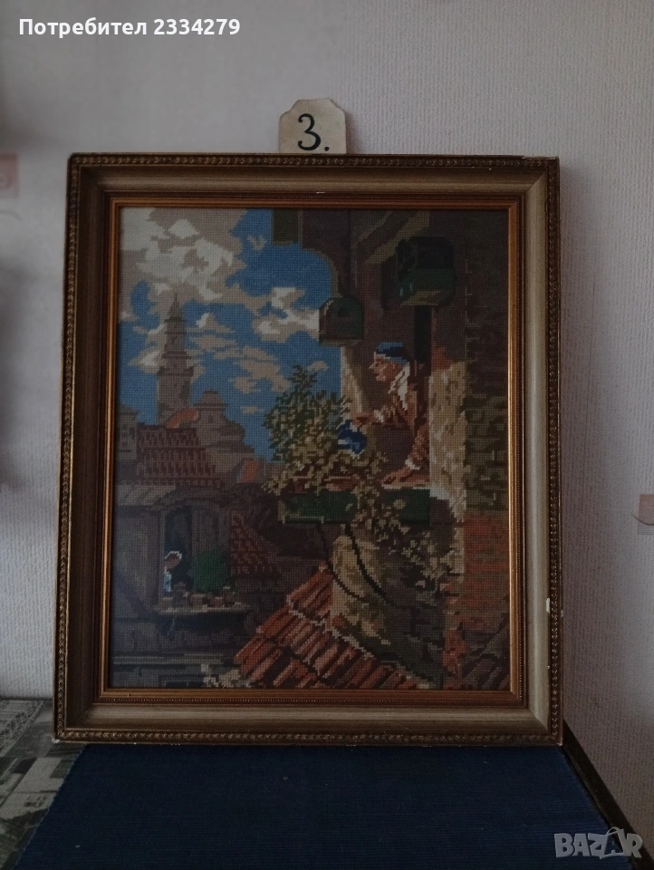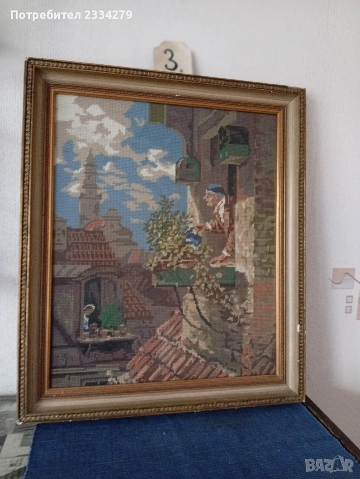 N:3 гоблен изобразяващ " Хисаря на балконът". По картината ,,Любителя на цветя в таванската стая" Карл Шпицвег", дървена рамка орнаментирана барокова стил размер 50х60 см., цена 35€.;