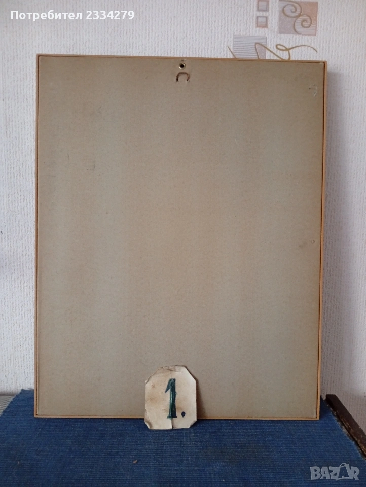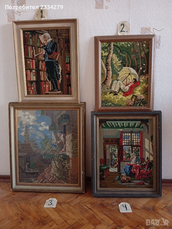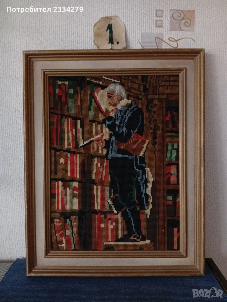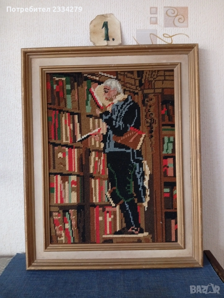 N:1гоблен изобразяващ прочутата картина ,,Книжният плъх" от немският художник Карло Шпицвег 1850г., дървена рамка с размери 40х50см., цена 30€.;