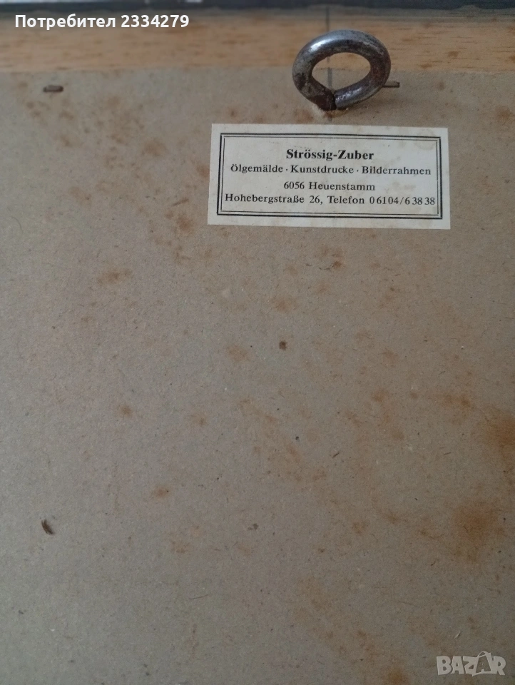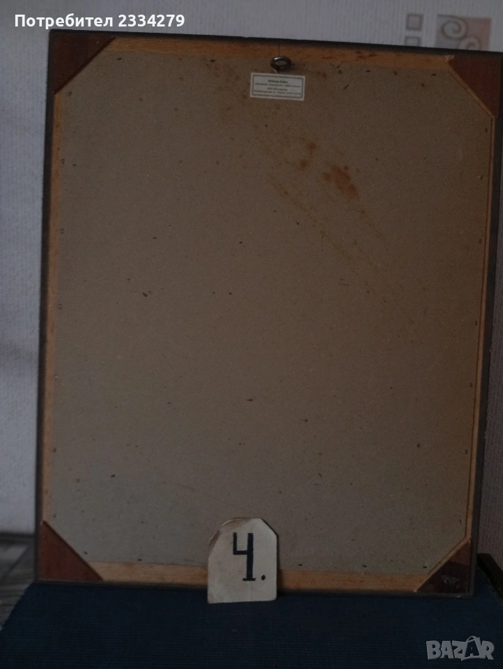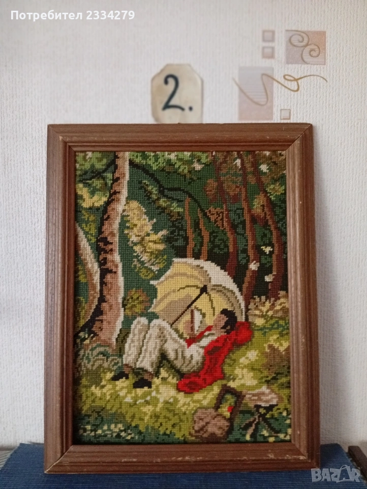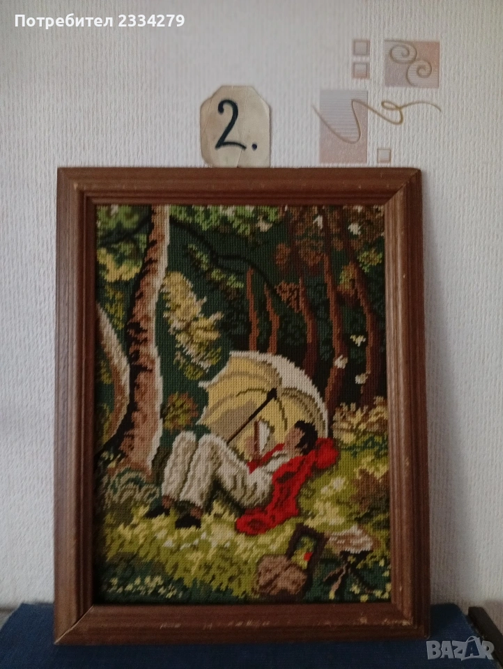 N:2 винтидж немски гоблен изобразяващ ,,Човек под чадър" , дървена рамка с размери 47х37см., цена 20€.;