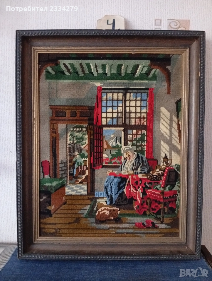 N:4 ръчно бродиран гоблен ,,Холандската стая" по картина на Абрахам Ван Стрий 1870г., красива дървена барокова рамка с размери 54х44см., цена 35€.;