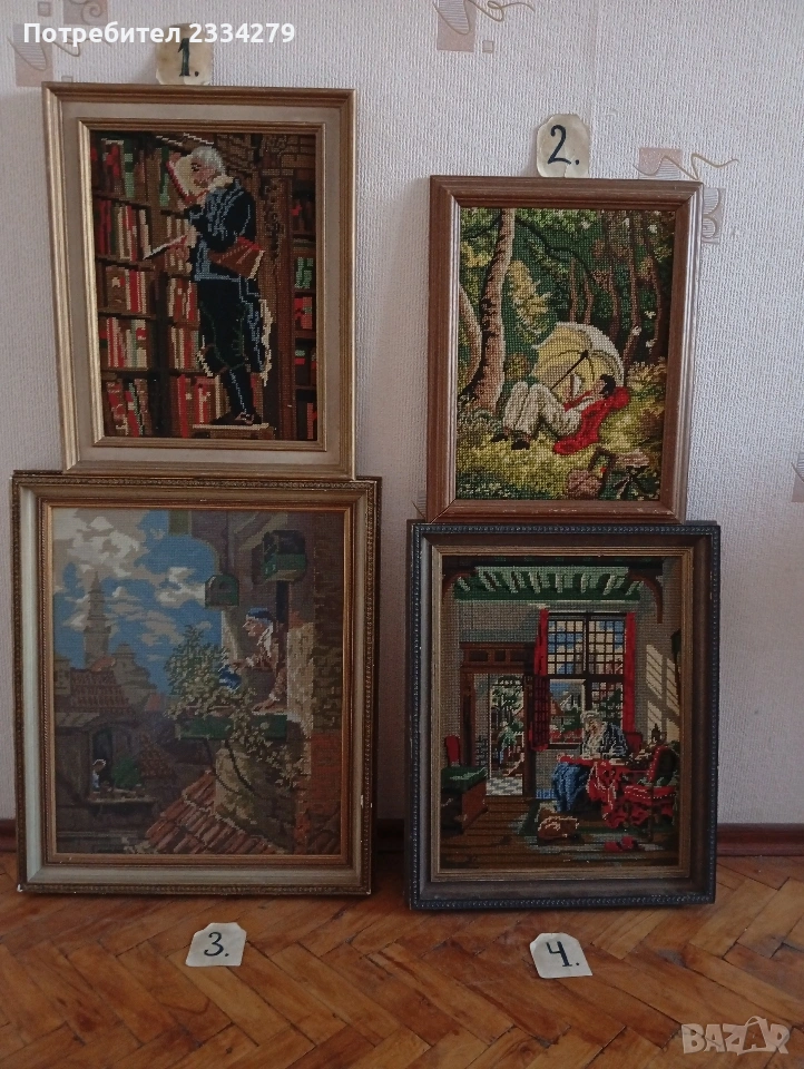Стари гоблени поставени в дървени рамки.